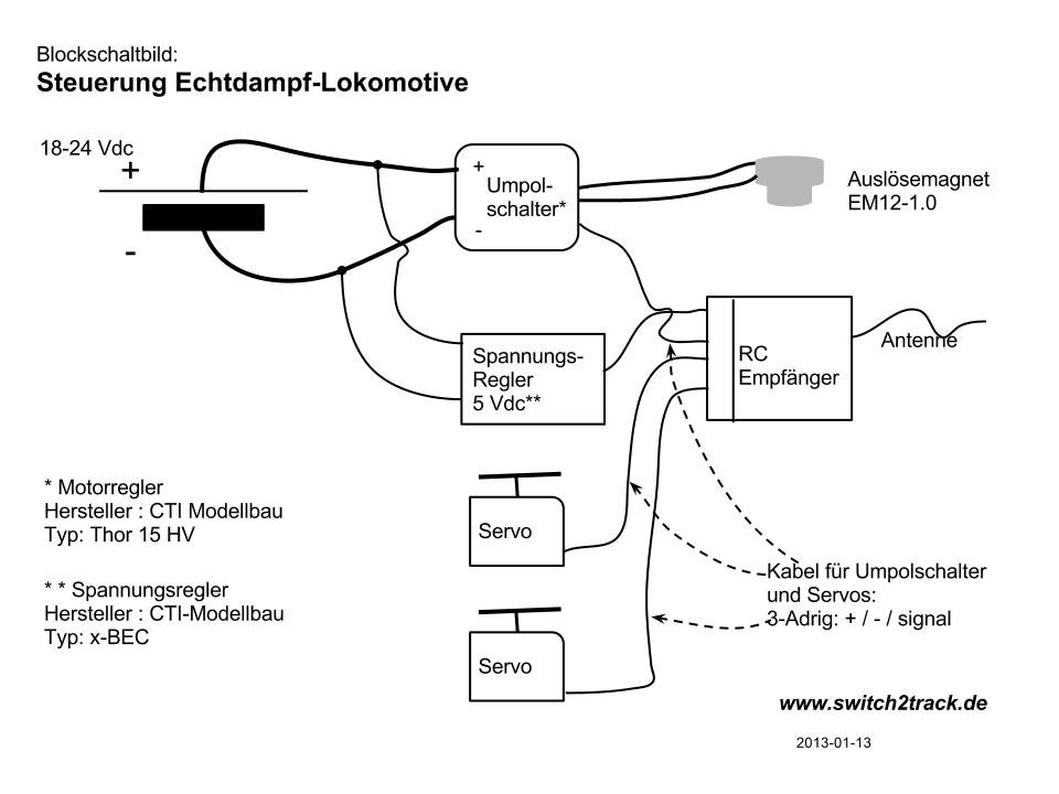 Im Bild unten ist der Anschluß des Magneten und der Fernsteuerung an einer Echtdampf-Lok dargestellt. Der Elektromagnet benötigt ca. 12 Vdc. Die Lok ist daher mit einem entsprechenden Akku auszurüsten. Zur Versorgung der Fernsteuerung, weiterer Servos für den Dampfregler und die Umsteuerung sowie des Umpolschalters ist ein separater BEC (=Battery Eliminating Circuit) oder ein genügend leistungsfähiger Festspannungsregler für 5 Vdc und ca. 3 A vorzusehen. Einen separate BECs gibt es bei cti-modellbau.de (Typ. X-BEC 3 A).