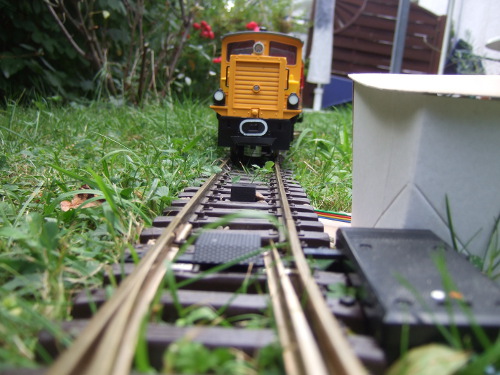 Auf der Unterseite der Lok ist nur ein kleiner elektrische Magnet, der die Weich steuert anzbringen. Das kann zum Beispiel so wie im Bild untern aussehen. Gut ist der Magnet unter der kleine Köf zu erkenne. Zwischen den Schienen der Sensor und dei Weiche. Die genaue Anordnung hängt von den Platzverhältnissen im Einzelfall ab. Der Magnet ist an der Oberseite mit einer zentrischen M3 - Gewindeborhung versehen und ist daher einfach zu montieren. Bei der Montage des Magnets sollte man darauf achten, dass ein Abstand von ca. 1 mm zum Sensor nicht überschritten werden sollte. Empfohlene Geschwindigkeit bei der Fahrt über den Sensor: Maximal 0,2 m/s .